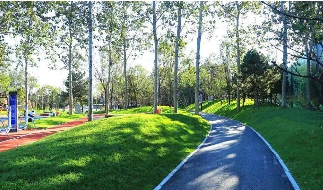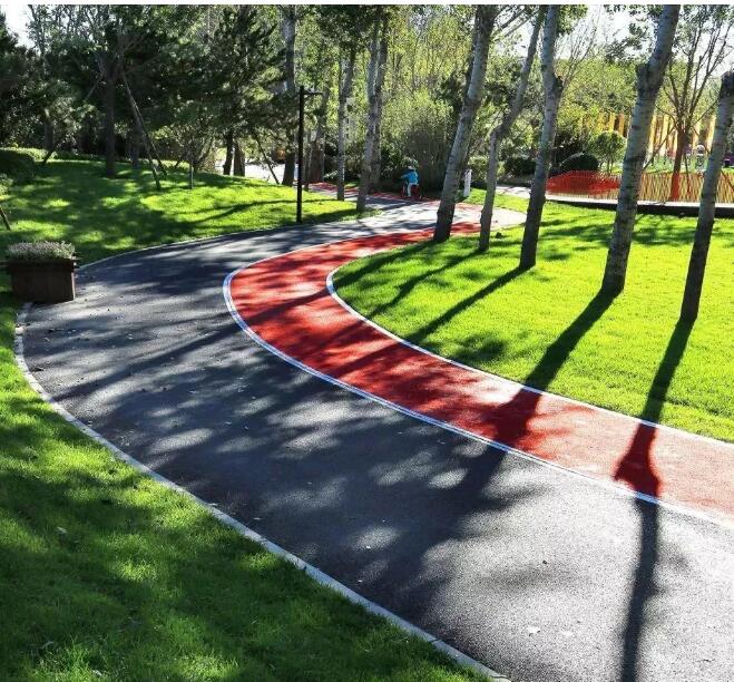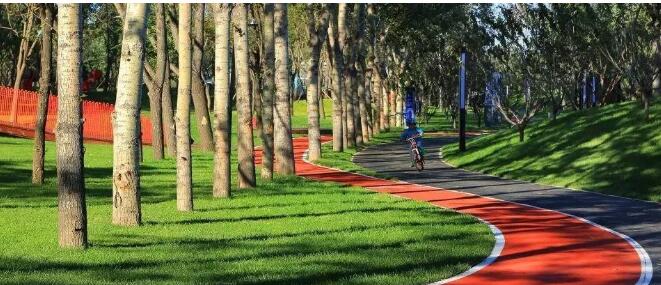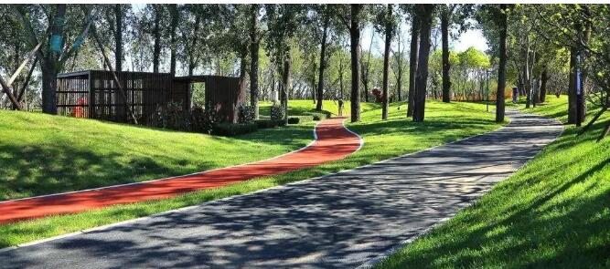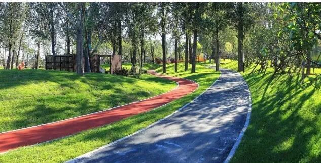 公園中設計了2.5 m寬的瀝青道路和1.5 m寬的塑膠跑道兩種路線,