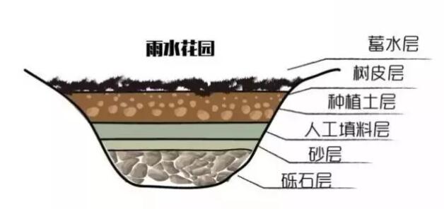 雨水花園要求雨水在短期之內(nèi)下滲凈化,一般1至4小時(shí)之內(nèi)下滲完畢,因此土壤結(jié)構(gòu)較普通花園的滲水性更強(qiáng),要求有相對普通花園更加復(fù)雜的土層結(jié)構(gòu)。