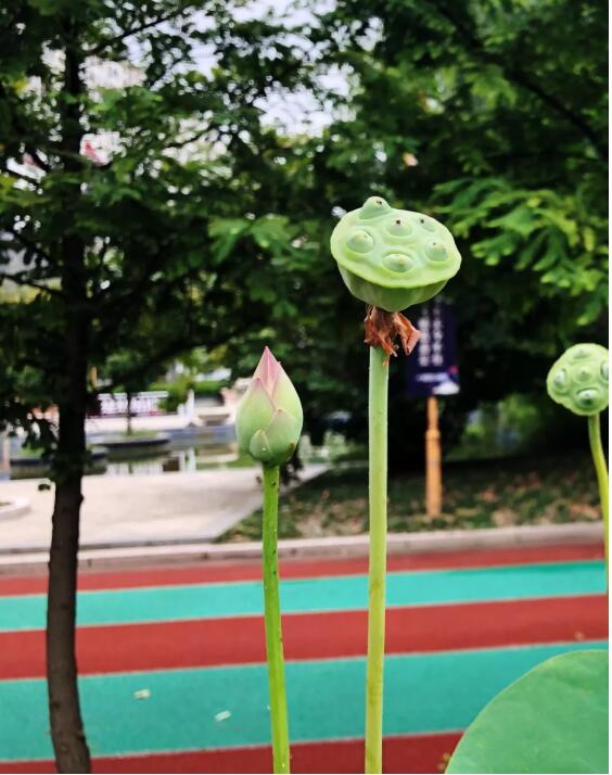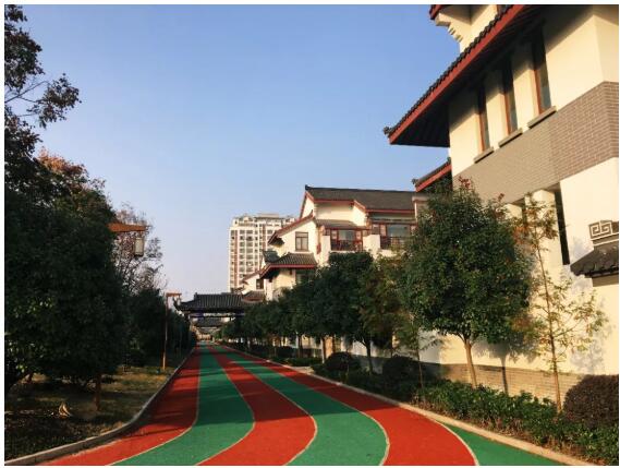 跑道呈橢圓形狀,南北長,東西短。跑道的外側(cè)是筆直的行道樹,東西兩側(cè)一律是排列整齊的水杉,南邊入口廣場(chǎng)外側(cè)是法國梧桐,內(nèi)側(cè)緊挨東西向跑道的是廣玉蘭,北面臨河。