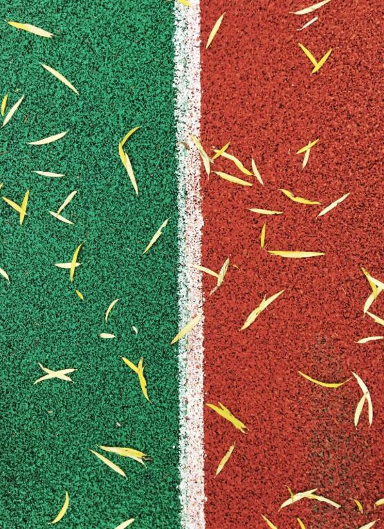 跑道是彩色的,紅色間著綠色,三條是紅色的,兩條是綠色的,像是彩色的五線譜攤鋪在綠色的畫板上一般。