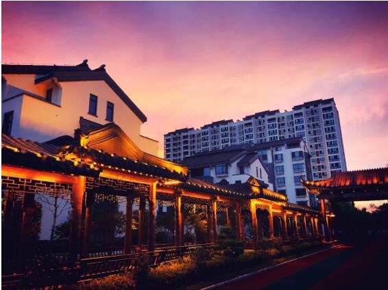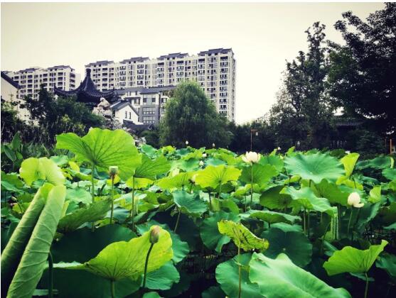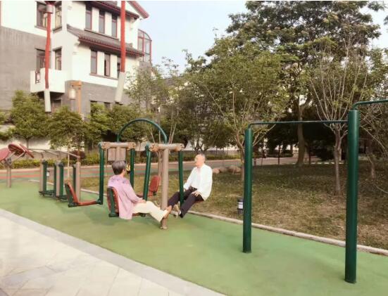 最南邊是一個(gè)小型的兒童露天樂園,幾個(gè)紅色、黃色、藍(lán)色的滑梯、迷宮、秋千,圍成一個(gè)小天地;兒童樂園的北面是一個(gè)泳池連著的飛檐峭壁的中式建筑,在建筑物的北面有一個(gè)小橋、流水、石板路散布其中的荷花池,荷花池的西側(cè)是用太湖石堆砌出的一座假山;再向北又是一個(gè)小水池和小廣場(chǎng),小廣場(chǎng)上放置著一些單杠、雙杠及老年人用的健身器材。