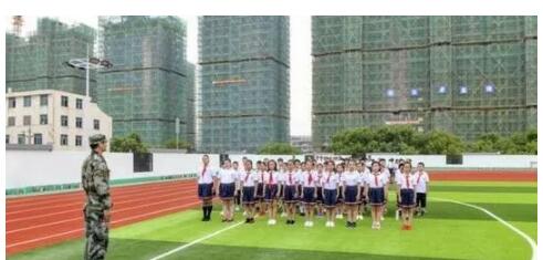 9月3日,浙江臺州市南官小學開學第一課,孩子們在空中環(huán)形操揚跑道上軍訓。