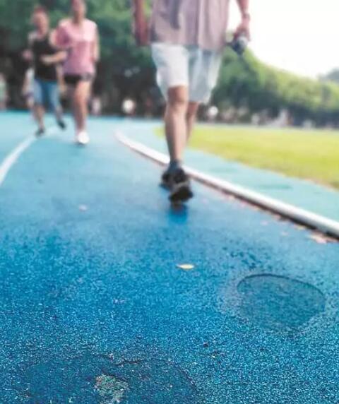 市區(qū)中山公園內的新塑膠跑道,經過三個月的改造提升,實現(xiàn)“華麗轉身”,不僅顏值高,舒適感也提升了,深受前來運動健身的市民們歡迎。但是,一些不文明現(xiàn)象也隨之出現(xiàn),比如有些人穿著釘鞋或高跟鞋在跑道上鍛煉和行走,給藍色的塑膠跑道留下難看的印記。