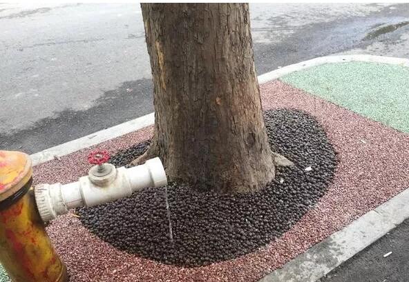 隨后,記者在其中一棵綠化樹(shù)旁看到,一個(gè)施工用水的消防栓上接著一個(gè)取水的塑料管,一股細(xì)細(xì)的水流不停的從管口流出,正好流在綠化樹(shù)下的棕色小圓石上,但水流并沒(méi)有向外溢出,而是順著棕色圓石之間的縫隙向下滲透。