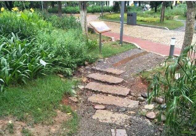 改造前廣場鋪裝大多數(shù)為不透水鋪裝,產(chǎn)生徑流量較大?,F(xiàn)狀綠地大部分高出道路廣場,造成雨水難以進入綠地;表層紅土之下的粘土透水性一般,不利于雨水滯留滲排。按照海綿城市建設(shè)要求進行嚴(yán)謹(jǐn)?shù)挠嬎愫筒季?,項目共建設(shè)雨水花園462平方米,植草溝165平方米,生態(tài)滯留帶791平方米,濕塘和濕地180平方米,地下蓄水回用池300立方米,使用生態(tài)透水鋪裝1076平方米。實現(xiàn)了以下綜合目標(biāo):