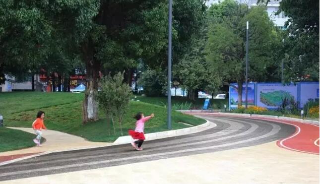 具備滲、滯、蓄、凈、用、排功能的雨水設(shè)施在多個場合轉(zhuǎn)化為親水空間,給市民帶來可供體驗的”雨水適應(yīng)性”景觀。同時,為盡量減少對場地現(xiàn)有可利用資源的破壞,設(shè)計師保留了原來的大致地形和主要交通通道,保留原有長勢較好的喬灌木,僅把綠籬帶移除以增加景深,結(jié)合海綿措施和豎向優(yōu)化進行改造;原有鋪裝石材被回收用做新廣場內(nèi)鋪路圖案的材料或者擋水堰石,占現(xiàn)有硬地百分之60%的灰色鋪裝轉(zhuǎn)變?yōu)轱柡赜蛏实纳鷳B(tài)彩色透水面層,并且為市民增加了更加舒適的健身活動場地。改造后的廣場體現(xiàn)著生態(tài)理念的創(chuàng)新,光透水鋪裝就運用了包括透水碎石路、大孔隙塊石步道、陶瓷透水磚、透水混凝土面層等五種新技術(shù)類型;蓄水池在當(dāng)?shù)卣舭l(fā)量大的氣候特點下發(fā)揮了應(yīng)用的作用,實現(xiàn)了對綠化噴灌系統(tǒng)的回用補水。