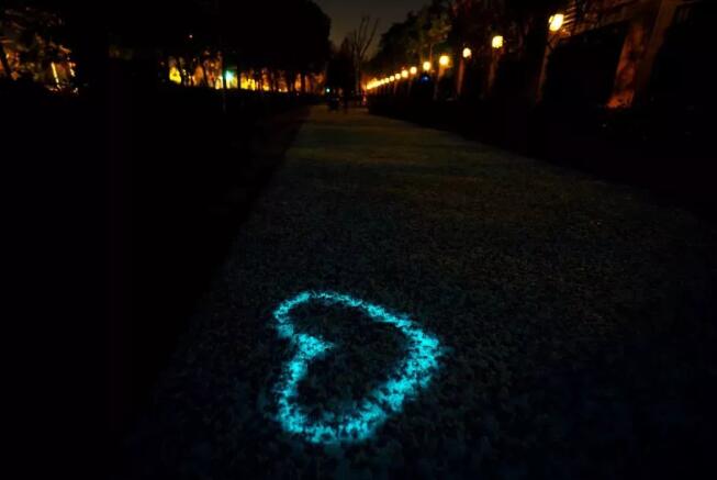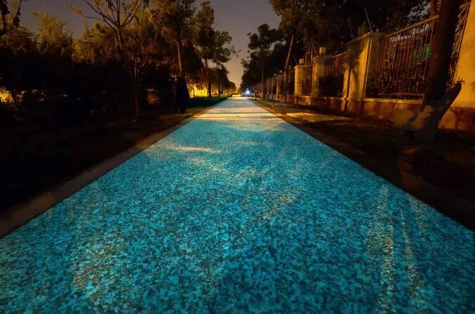 相關(guān)工程師介紹說(shuō),發(fā)光的原理不復(fù)雜,這和道路使用的透明結(jié)合料有很大關(guān)系。透明結(jié)合料與具有一定通透和反光效果的石料混合,同時(shí)在道路的設(shè)計(jì)上采用了超大空隙結(jié)構(gòu)設(shè)計(jì),發(fā)光材料在白天充分吸收并儲(chǔ)存能量,夜間以光能的形式釋放,使整個(gè)路面在高能和原始狀態(tài)下切換,產(chǎn)生發(fā)光的效果。