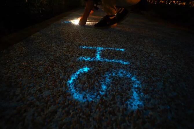也有不少人選擇自己動(dòng)手在發(fā)光步道上DIY一些有趣的文字和圖案~用手電筒或手機(jī)照明等光源當(dāng)“畫筆”,將發(fā)光路面作“畫布”,盡情釋放想象力吧?。≒S:用手電筒照一兩分鐘即可,稍微一照就有效果~)