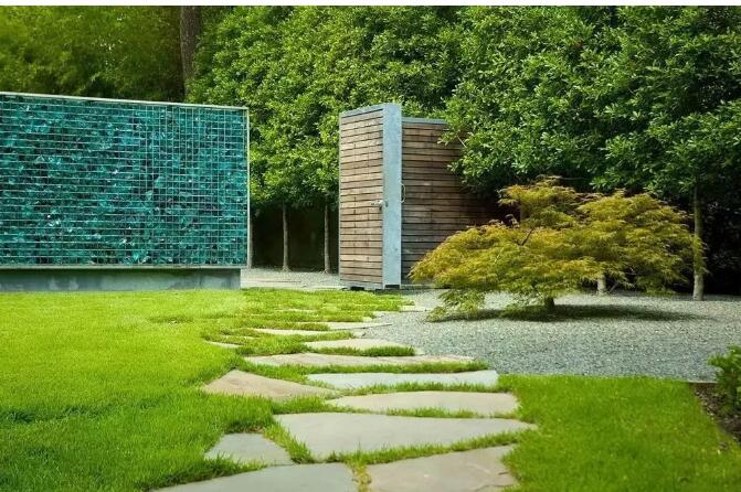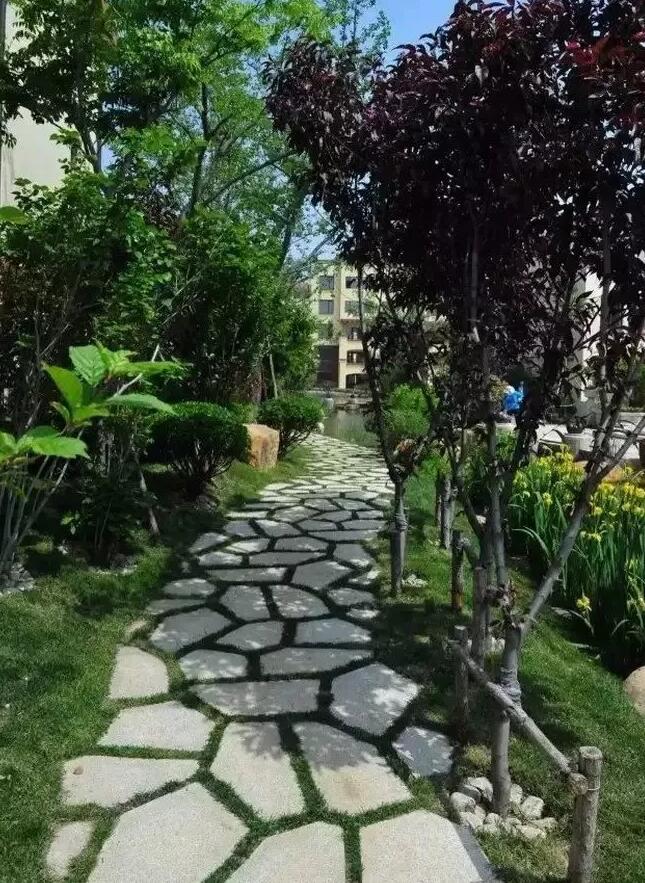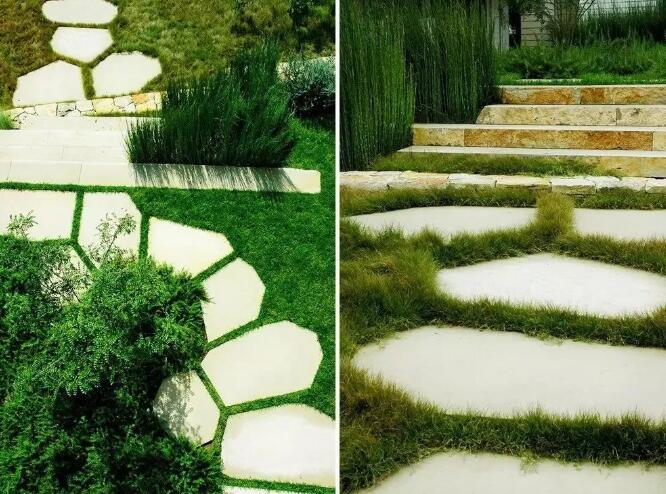 把天然或各種形式的預(yù)制混凝土塊鋪成冰裂紋或其他花紋,鋪筑時在塊料間留3~5cm的縫隙,填入培養(yǎng)土,然后種草。如:冰裂紋嵌草路、花崗巖石板嵌草路、木紋混凝土嵌草路、梅花形混凝土嵌草路。