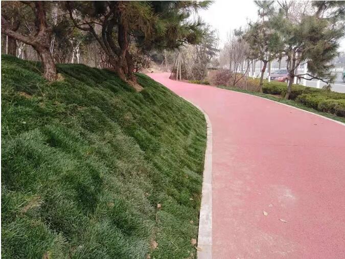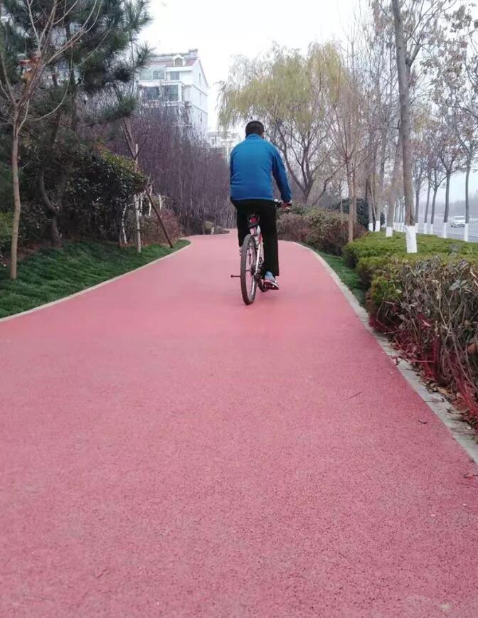 這是國際上綠道的流行色,首先可以和別的道路區(qū)別,另外在周邊植物的襯映下,視覺景觀效果會更好。紅色路面看上去像塑膠道,其實是透水混凝土制成,透水性、保水性、防滑性、耐磨性、景觀性都很好,既能保障騎車人較佳的騎行感受,又能保持道路兩側生態(tài)系統(tǒng)的連續(xù)。”