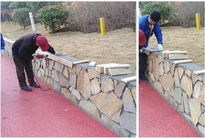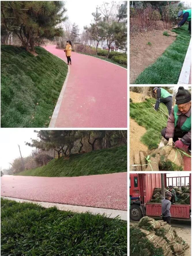 鋪設草坪,為防止坡度草坪傾滑,還采取了木楔固定措施。