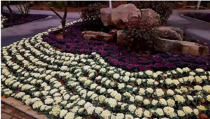 栽植羽衣甘藍等時令草花,點綴的五彩斑斕,引人入勝