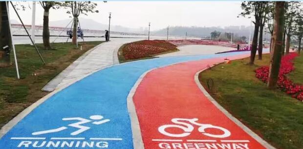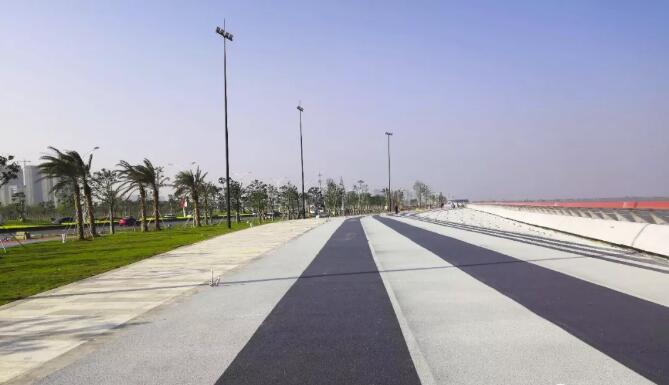 項(xiàng)目利用紅藍(lán)兩條濱水自行車道和綠道作為串聯(lián),將整個(gè)項(xiàng)目各分散部分完整地連接起來。整條透水海綿路面,利用經(jīng)特殊工藝處理的納米材料對(duì)膠凝材料進(jìn)行改性,改善了無機(jī)聚合物材料的物相組成和微觀結(jié)構(gòu),使之具有高吸水率、高透水率、高強(qiáng)度、抗?jié)B、抗凍、抗沖、耐磨、耐化學(xué)腐蝕等顯著優(yōu)點(diǎn),能對(duì)雨水進(jìn)行初步凈化。同時(shí),路面保護(hù)層采用水性環(huán)保耐磨材料,同時(shí)添加納米光觸媒材料,在提高耐磨性的同時(shí),可有效降解汽車尾氣,改善空氣質(zhì)量。