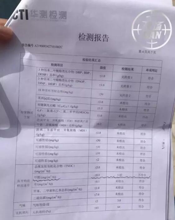 一周后業(yè)主們拿到檢測(cè)報(bào)告時(shí),大家都傻眼了:“取樣是全程公證的,檢測(cè)結(jié)果顯示甲醛含量是現(xiàn)行國(guó)標(biāo)的3.55倍,是上海地方標(biāo)準(zhǔn)的14.2倍,屬于嚴(yán)重超標(biāo)。”新國(guó)標(biāo)對(duì)甲醛釋放量的要求是≤0.4mg/(m2.h),上海團(tuán)標(biāo)的要求是≤0.1mg/(m2.h)。