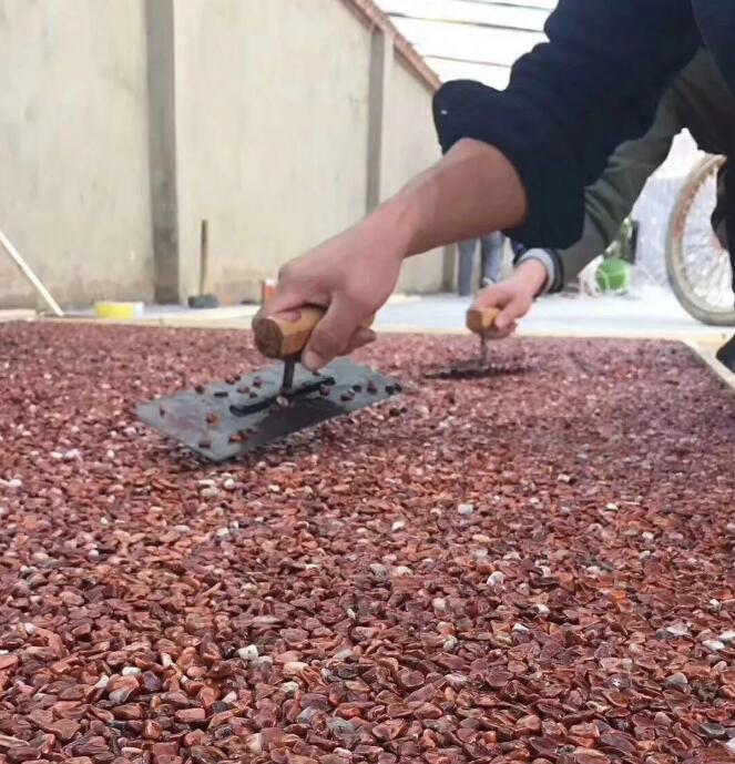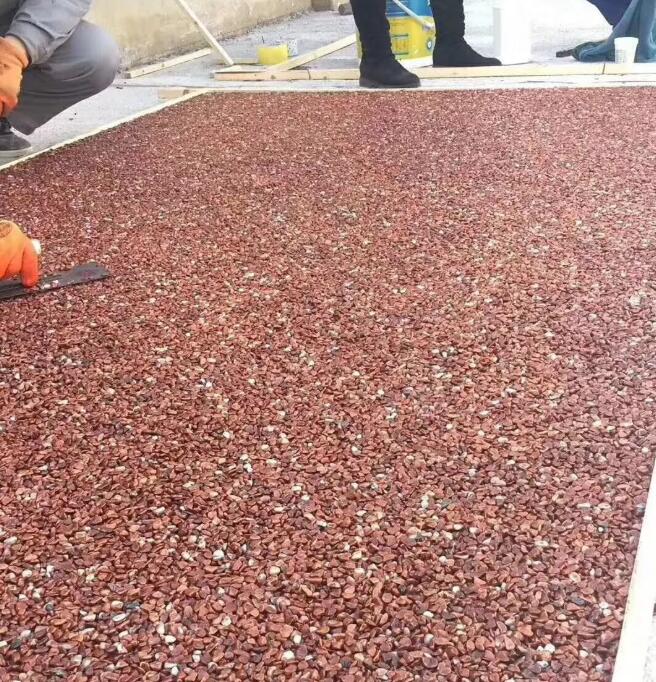 透水膠粘石以改性樹脂膠為粘接劑,各種天然石子、彩砂、彩色石子等)為骨料,加入多種高分子添加劑經(jīng)混拌制成。 彩色透水地坪擁有系列色彩配方,配合設(shè)計(jì)的的創(chuàng)意,中間的孔隙無水泥、砂等細(xì)骨料填充,因此為了增加鋪裝強(qiáng)度,必須添加各種性能的專用強(qiáng)化劑。針對(duì)不同環(huán)境和個(gè)性要求進(jìn)行鋪設(shè)施工。施工人員按照路面地塊、樹池等不同地塊需求進(jìn)行現(xiàn)場(chǎng)鋪設(shè)、安裝,待整個(gè)路面鋪設(shè)完畢后覆蓋塑料膜加以保護(hù),并噴上一層保護(hù)劑,確保材料徹底變干后顏色能長(zhǎng)期保有,同時(shí)也可延長(zhǎng)路面使用壽命。