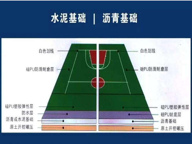 ■ 硅PU球場(chǎng):材料彈性較好,防滑適中,舒適耐用,耐磨損,耐油污,耐候性強(qiáng),可全天使用;平整美觀易于清潔,色彩搭配多樣。