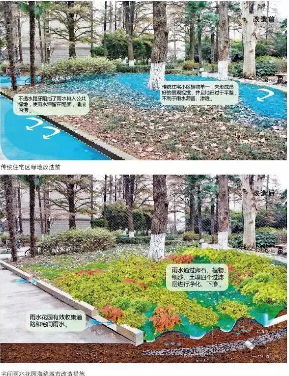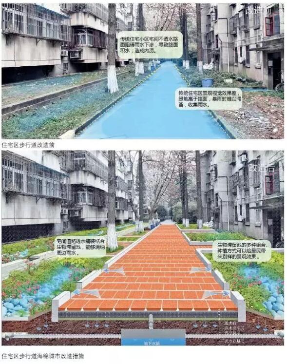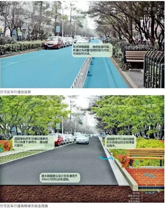 傳統(tǒng)住宅區(qū)中的宅間道路和綠化帶可以改造成透水路面和生物滯留池,用來(lái)收集道路上的雨水,避免路面雨水沉積對(duì)居民生活造成影響。