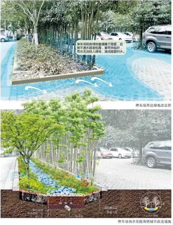 傳統(tǒng)住宅區(qū)中的停車(chē)場(chǎng)可以改造成透水植草磚生物滯留帶,用來(lái)收集周?chē)晁?br />