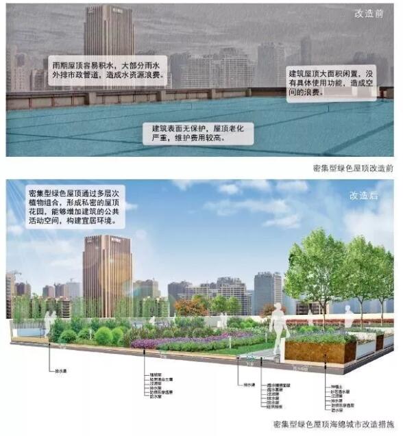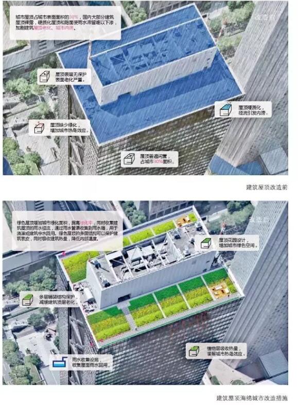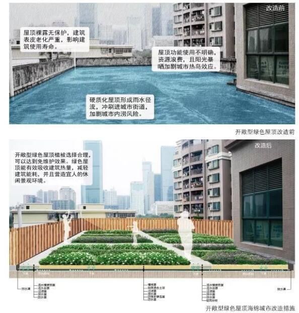雨洪來(lái)臨時(shí),建筑屋頂產(chǎn)生的徑流是導(dǎo)致城市內(nèi)澇的重要原因之一。因此,將城市的建筑屋頂改造為綠色屋頂能有效緩解城市雨水徑流壓力。一方面,通過(guò)海綿城市結(jié)構(gòu)來(lái)收集、儲(chǔ)存雨水,并利用雨水進(jìn)行澆灌,可以節(jié)省各種能耗;另一方面,綠色屋頂將形成良好的城市景觀,提升城市的整體綠化率。