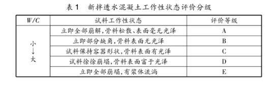 制備工藝對(duì)透水混凝土的性能具有多方面的影響,如水泥裹石法、“濕—濕”工藝、上置式振動(dòng)成型法分別可對(duì)其抗壓強(qiáng)度、強(qiáng)度均勻性、孔隙率以及平整度等性能做出不同程度的調(diào)整。在比較了不同的透水混凝土成型工藝后,張賢超發(fā)現(xiàn)采用漿體裹石法之后的透水混凝土,其抗壓強(qiáng)度能得到 10% 的提高,透水率及其他基本性能也得到了明顯改善。秦旭朝研究了新拌透水混凝土的工作性狀態(tài),結(jié)合其表觀性狀和結(jié)構(gòu)特點(diǎn)對(duì)其工作性狀態(tài)提出了一種評(píng)價(jià)分級(jí)體系,見表1;其中代表著水泥漿稠度過大,難以均勻包覆粗骨料的等級(jí)“A”和“B”,以及代表著水泥漿太稀,難以穩(wěn)定膠結(jié)于粗骨料上的等級(jí)“D”和“E”均是不合格的。只有等級(jí)“C”方能合格。
