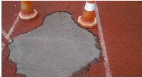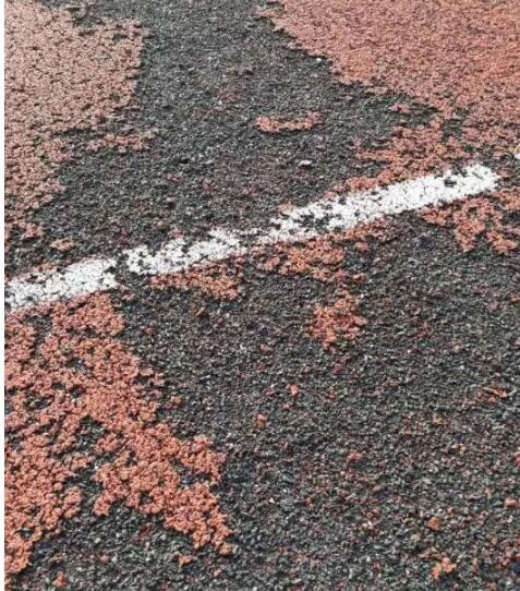 在跑道面層開裂有縫隙的地方,清除所有破損的塑膠層。開裂大的地方,擴大鏟除面積20cm以上;如開裂縫有高低差,則需要擴大鏟除面積至50cm以上。