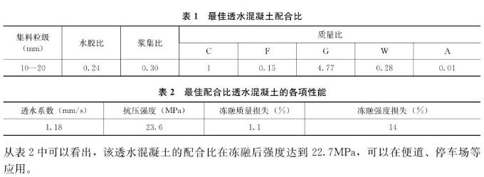 結合透水性、抗壓強度值及抗凍性能總體分析,為確定適合保定地區(qū)最低溫度的透水混凝土配 合比,選取最佳組合確定最佳配合比,并進行各種性能測試(表1和表2)。