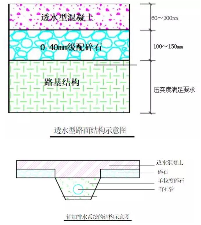 透水型路面既可以將路面的雨水滲透到路基中或是周圍的土壤中加以儲存,廣泛應用于園林、公園、球場等地;也可以附加排水系統(tǒng),加大滲透能力,以保證路基強度,主要應用在道路、通道、人行道、廣場等道路承載大的地方。具體如下圖所示: