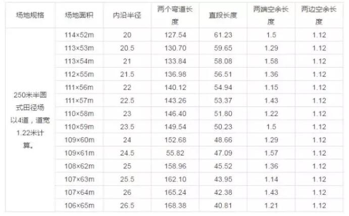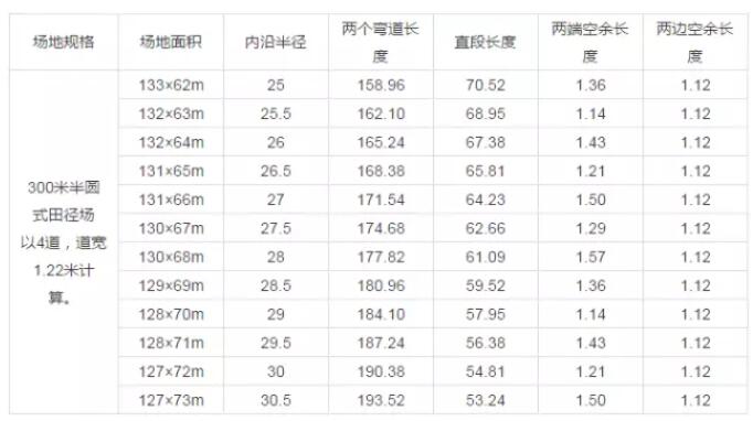 4、驗(yàn)證半圓式田徑場(chǎng)縱軸線長度是否符合空地長度要求縱軸線長度=(彎道半圓半徑+分道道寬×6)×2+直段長度=(25+1.22×6)×2+70.52=135.16m(138m-135.16m)÷2=1.42米>1米整個(gè)標(biāo)準(zhǔn)塑膠跑道運(yùn)動(dòng)場(chǎng)第一道實(shí)跑長度和縱軸長、橫軸寬均在空地長寬允許范圍內(nèi),四周留有空余地均大于1米,滿足要求。如不滿足要求,可以用不同的半徑按上述方法進(jìn)行計(jì)算,找出適合的半徑和直段長度。