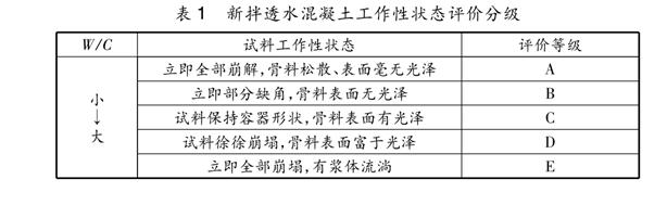 制備工藝對透水混凝土的性能具有多方面的影響,如水泥裹石法、“濕—濕”工藝、上置式振動成型法分別可對其抗壓強度、強度均勻性、孔隙率以及平整度等性能做出不同程度的調(diào)整。在比較了不同的透水混凝土成型工藝后,張賢超發(fā)現(xiàn)采用漿體裹石法之后的透水混凝土,其抗壓強度能得到 10% 的提高,透水率及其他基本性能也得到了明顯改善。秦旭朝研究了新拌透水混凝土的工作性狀態(tài),結(jié)合其表觀性狀和結(jié)構(gòu)特點對其工作性狀態(tài)提出了一種評價分級體系,見表1;其中代表著水泥漿稠度過大,難以均勻包覆粗骨料的等級“A”和“B”,以及代表著水泥漿太稀,難以穩(wěn)定膠結(jié)于粗骨料上的等級“D”和“E”均是不合格的。只有等級“C”方能合格。
