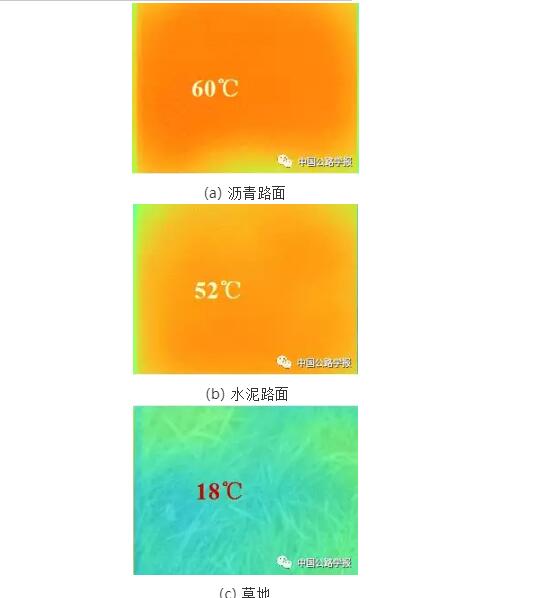 常規(guī)的路面材料熱容小、吸熱快,在太陽(yáng)輻射下,升溫迅速,是城市熱島效應(yīng)日益加劇的主要原因,圖4所示為夏季城市不同下墊面紅外熱成像溫度。