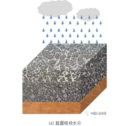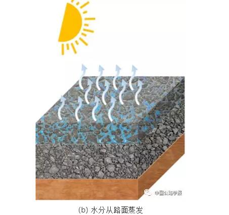 可以通過(guò)改變路面材料的熱物理性質(zhì)和路面與環(huán)境的熱交換方式,從而得到具有降溫功能的路面。具體的實(shí)現(xiàn)途徑為,以多孔路面材料為基體,在其孔隙中灌注吸水保水性材料,這種材料具有較好的吸水和保水能力(圖5)。在雨天或者灑水時(shí),能夠吸收水分,當(dāng)環(huán)境溫度較高時(shí),利用路面材料中持有的水分蒸發(fā)來(lái)降低路面溫度,減弱熱量在瀝青路面中的積累,改善瀝青路面的熱輻射效應(yīng),可以降低路表和路域的環(huán)境溫度,為道路周圍的的行人和行車提供舒適的環(huán)境,從而起到緩解城市“熱島效應(yīng)”作用。其實(shí)現(xiàn)原理如圖6所示。
