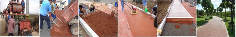 在澆筑之前,路基必須先用水濕潤。否則透水地坪快速失水份會減弱骨料間的粘結(jié)強度。由于透水地坪拌合物比較干硬,將拌和好的透水地坪和好的透水地坪材料鋪在路基上鋪平即可。