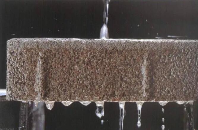 這是以硅酸鹽類水泥為膠凝材料、采用單一粒級的粗骨料,不用或少用細骨料配制的無砂、多孔混凝土。該種混凝土一般采用較高強度的水泥,集灰比為3.0-4.0,水灰比為0.3-0.35?;炷涟韬衔镙^干硬, 采用加壓振動成形,形成具有連通孔隙的混凝土。硬化后的混凝土內(nèi)部通常含有20%左右的連通孔隙,相應的表現(xiàn)密度低于普通混凝土, 通常為1 700-2 200 kg/ m3??箟簭姸瓤蛇_15-35 MPa, 抗折強度可達3-5 MPa, 透水系數(shù)為1-15mm/ s。該種透水性混凝土成本低,制作簡單, 可用于道路鋪筑及預制成品應用。但由于含有較多的連通孔隙, 其強度及耐磨性、抗凍性是工程應用技術主要指標。