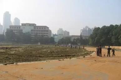 (2)基礎排水:采用龜背式排水,兩片球場排水溝相連形成環(huán)狀排水溝,達到場地排水要求。橫向、縱向坡度<3‰,表面應平坦,光滑,保證排水。