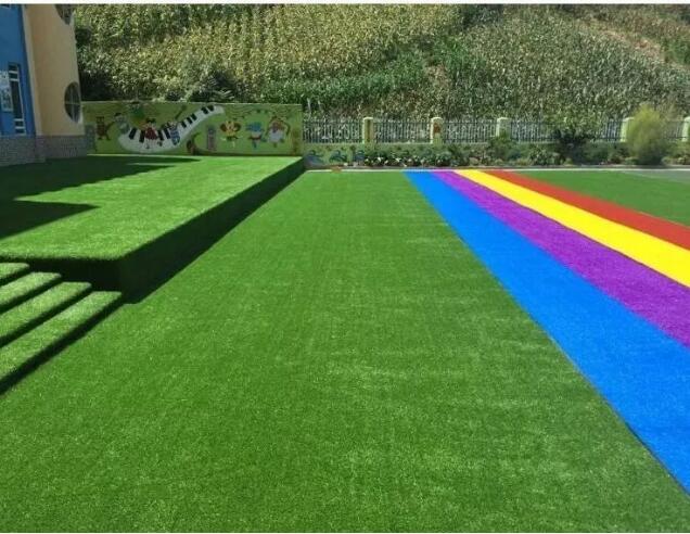 2、幼兒園的人造草坪美觀,多彩。在鋪裝的過(guò)程中,可以采取不同顏色的草坪拼接出不同圖案,可以有效提高幼兒園小朋友的思維。