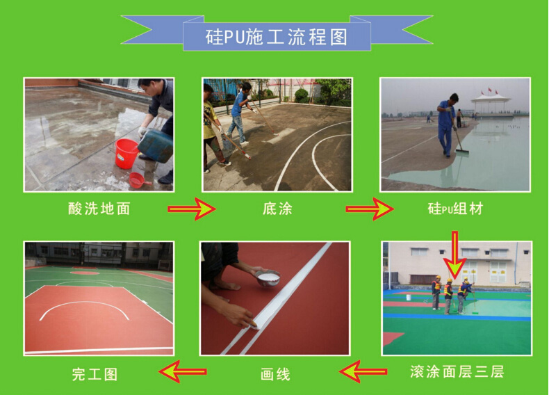 硅PU籃球場使用的硅PU材料是在PU球場材料的基礎(chǔ)上開發(fā)研制出來的新一代球場地面鋪裝材料,從根本上有效地解決了PU球場材料在專業(yè)性能、環(huán)保施工、使用壽命、日常維護等方面的不足之處,具有實用、環(huán)保、專業(yè)、經(jīng)濟的優(yōu)良性能。硅PU籃球場是由有機硅改性聚氨酯材料作為涂料,分多層(底涂、彈性層、加強層、面層)涂刮而成的新型塑膠球場;具上彈下彈結(jié)構(gòu)特征,屬于一種健康型專業(yè)彈性合成球場地面系統(tǒng)。