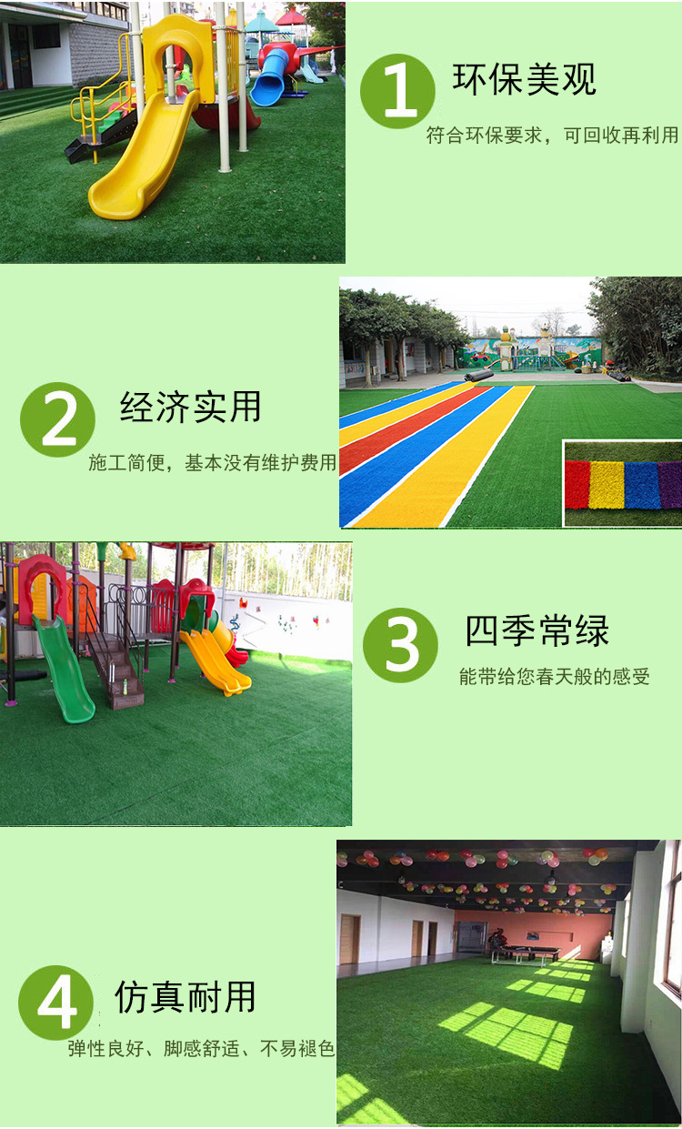 3、環(huán)保性:材料均符合環(huán)保要求,人工草坪面層可回收再利用;
