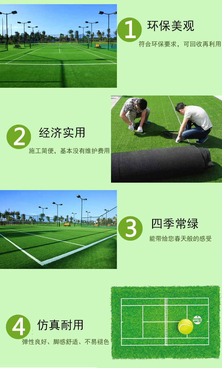 網(wǎng)球場(chǎng)人造草坪主要適用于:籃球場(chǎng)、網(wǎng)球場(chǎng)、門(mén)球場(chǎng)、幼兒園人造草坪、果嶺草等