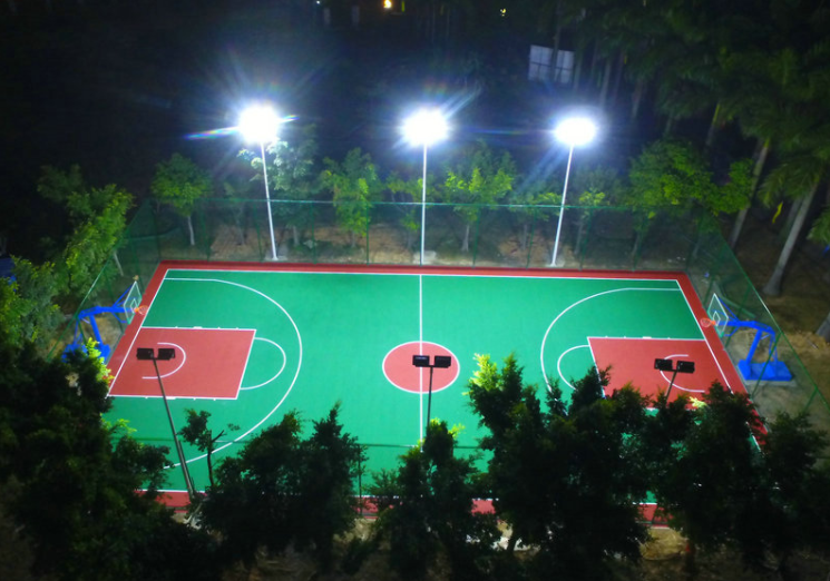 室外籃球場照明一般選用6米7米或8米的錐形鍍鋅管高桿燈,燈具的選擇上以射燈(金鹵燈)或LED燈為主,一個標(biāo)準(zhǔn)的室外籃球場(28*15m)需配置4-6條錐形燈桿,每根高桿燈裝配2-3盞400w金鹵燈,就可以很好的達(dá)到戶外籃球場夜晚照明的需求。