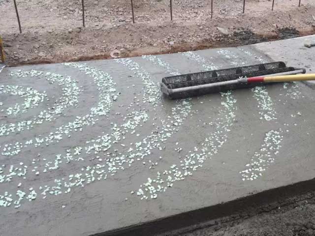 首先攤鋪普通的透水混凝土,將水泥、石子、膠結(jié)劑按照比例攪拌-攤鋪-整平抹光后,將人造夜光石通過人工嵌入混凝土的表面即可,擺放的形態(tài)隨意,最后噴涂罩光保護(hù)面油加強(qiáng)人造夜光石的粘接力和表面耐磨度。